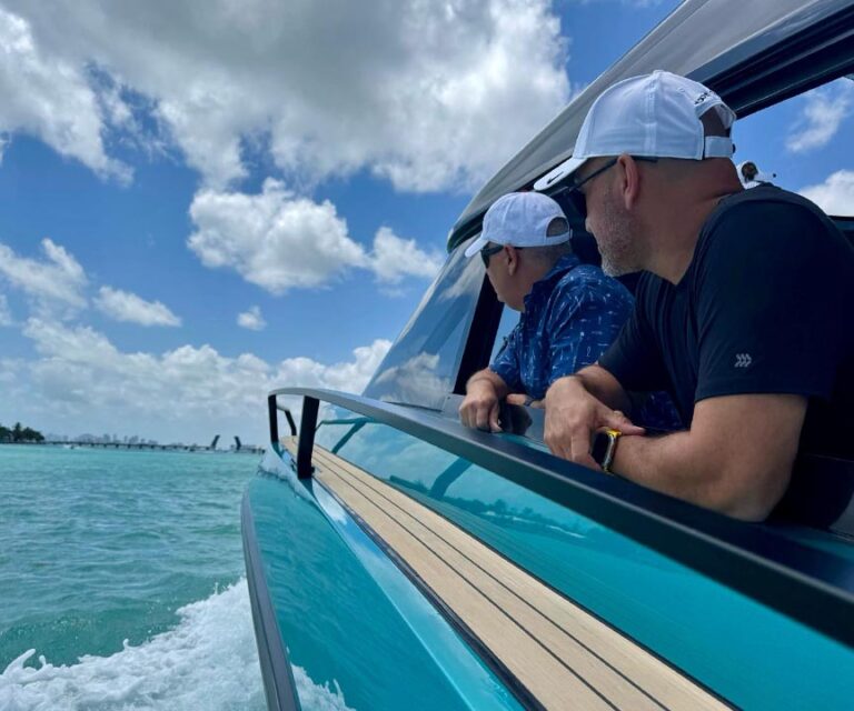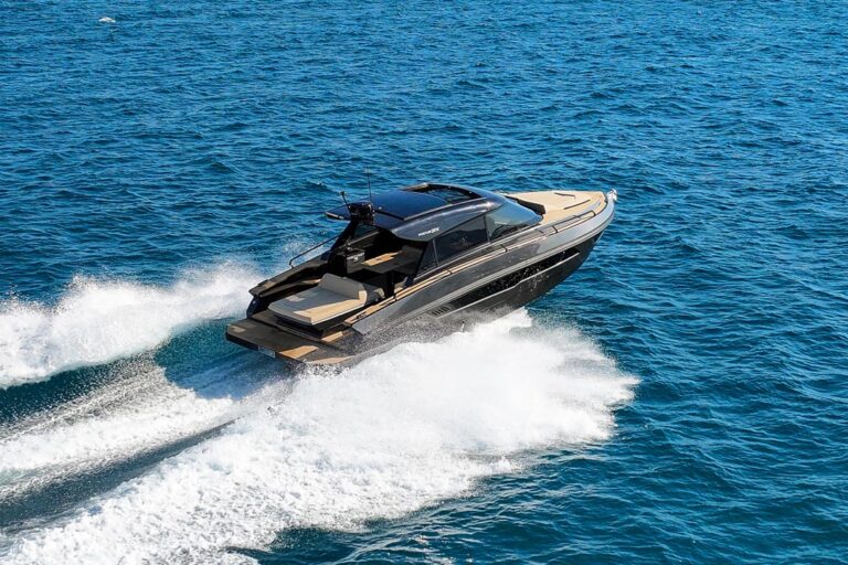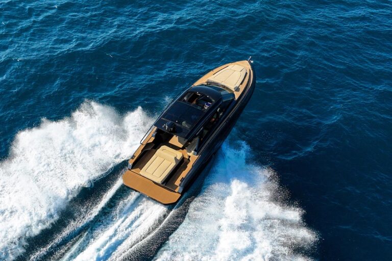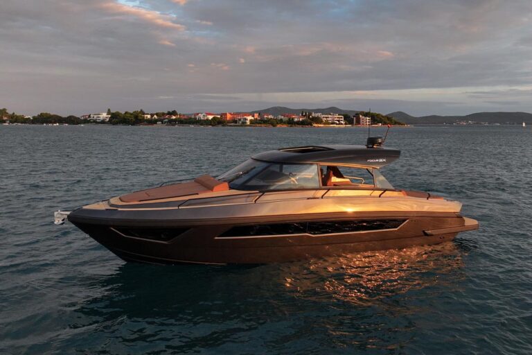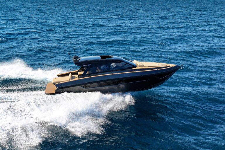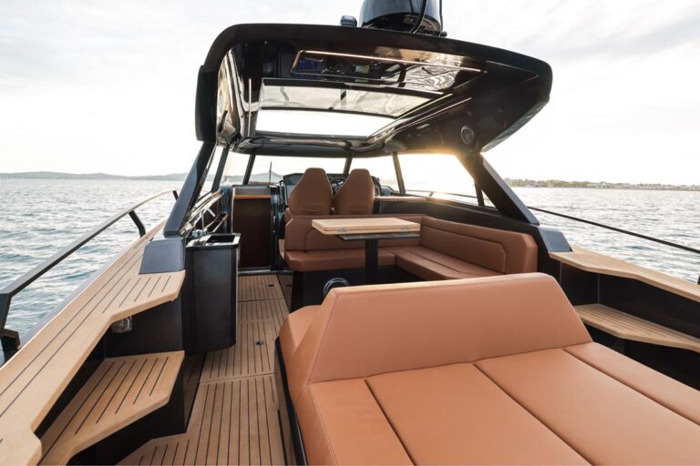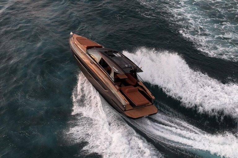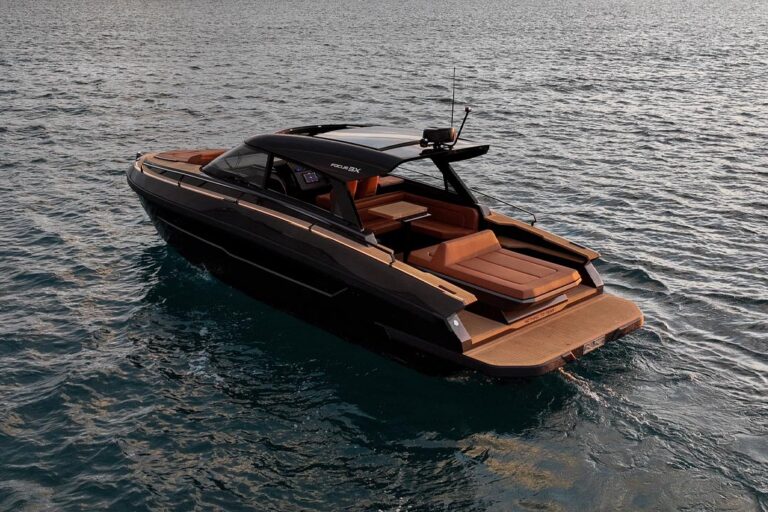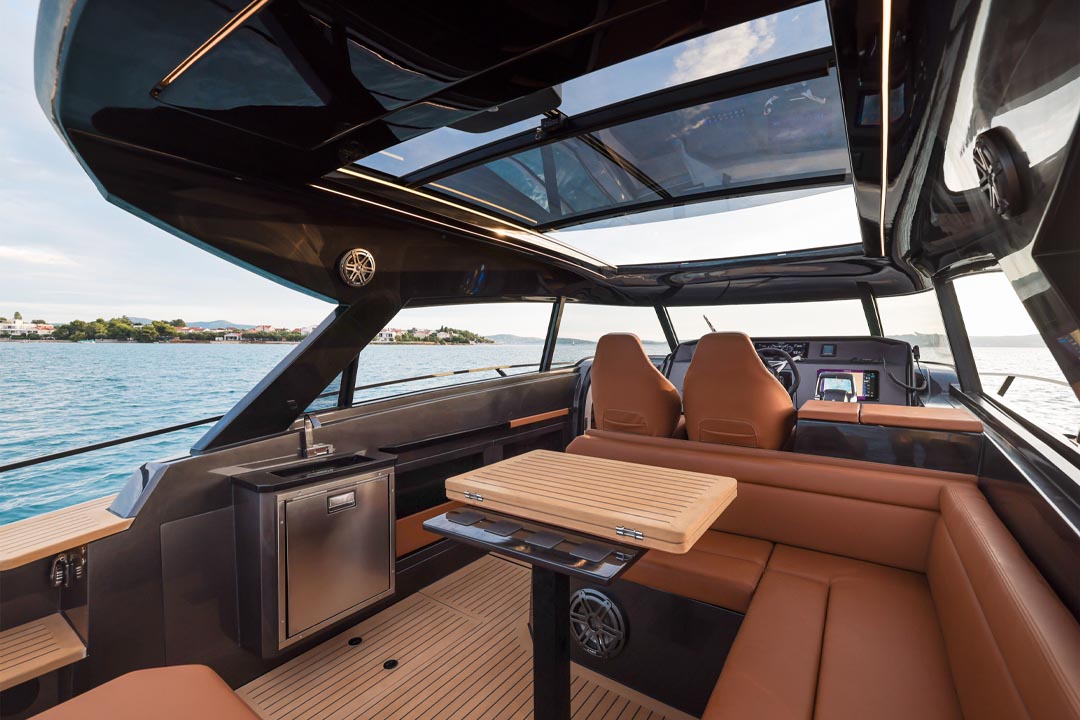 The Focus 3X boasts an innovative exterior with two-meter wide electric side windows and an electric glass hardtop in the cockpit, enabling it to seamlessly transition from a luxurious sport cruiser to an almost entirely open boat.