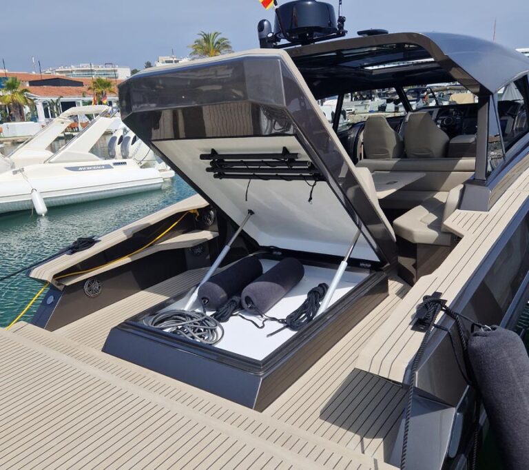 The cockpit is masterfully designed for open-air enjoyment, boasting a sleek forward sunbed and secure walkaround side decks, complemented by the eye-catching split side decks at the rear.